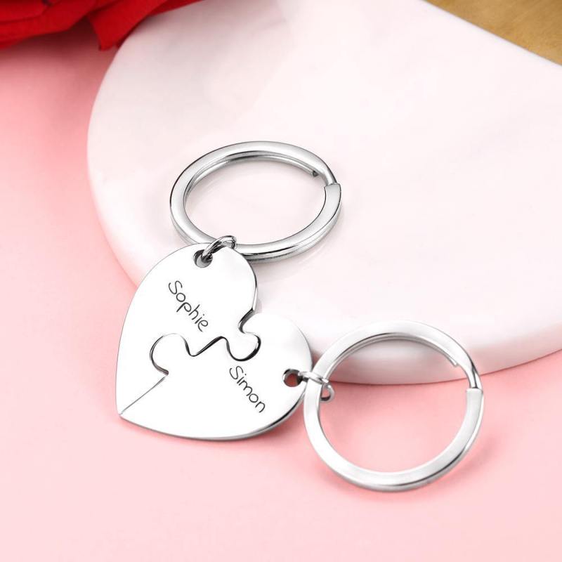 Custom Engraved Heart Puzzle Couple Keychain Set