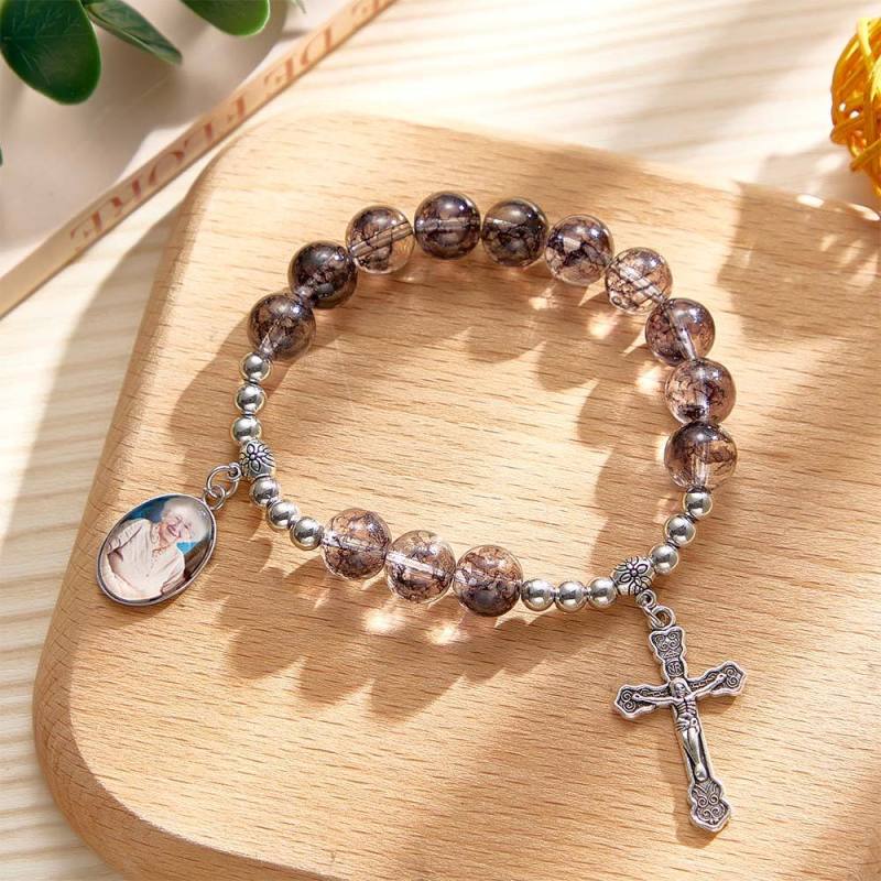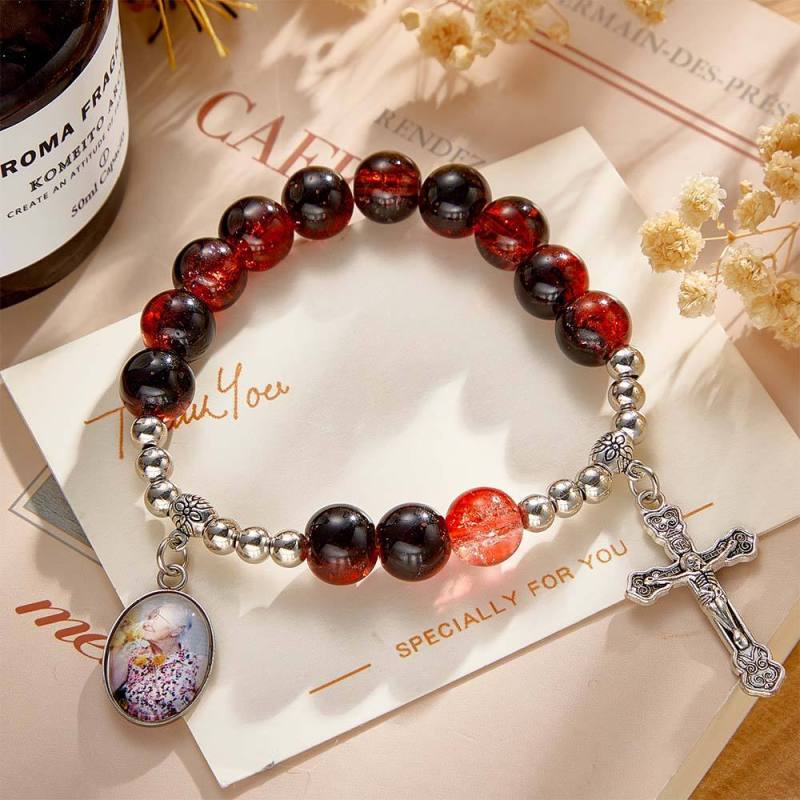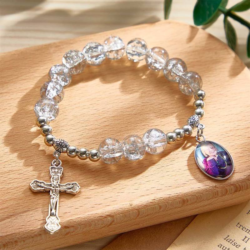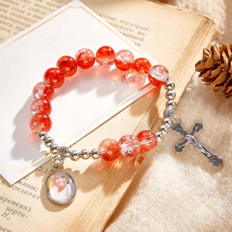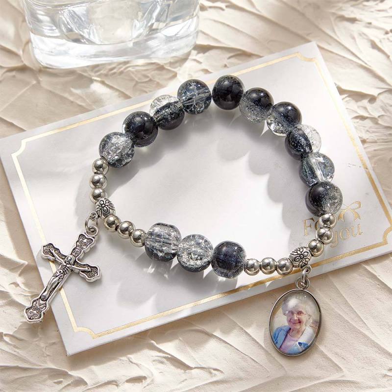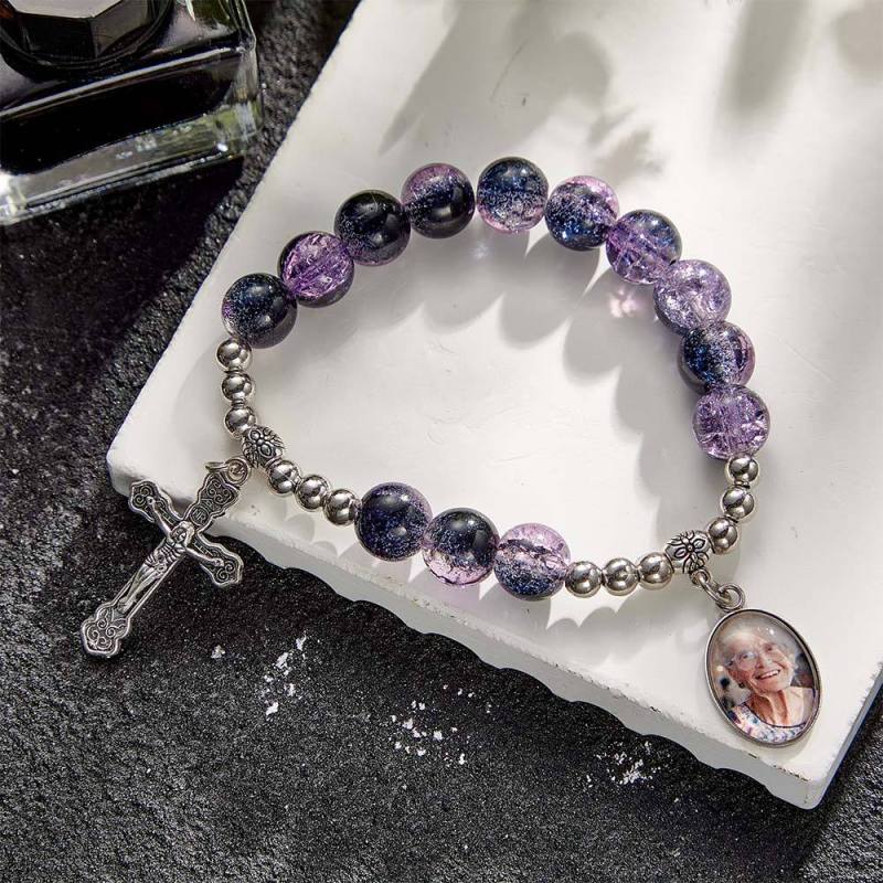 Custom Photo Rosary Beads Cross Bracelet Baptism Gift, First Communion Gift, Confirmation, Baby or Little Girl Keepsake Sentimental Memorial Gifts Crystal Prayer Personalized Gifts for Women