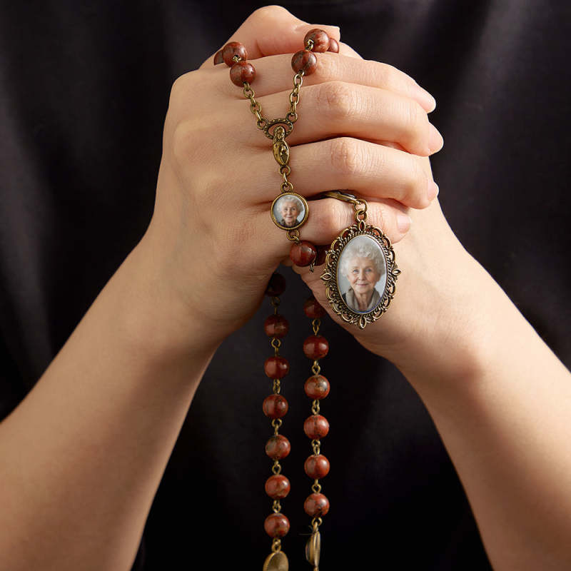 Custom Rosary Beads Cross Necklace Personalized Retro Sesame Stone Necklace with Photo