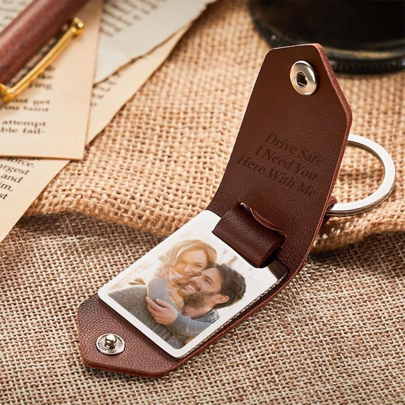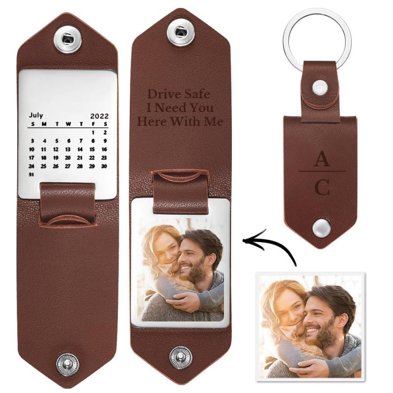 Personalized Leather Keychain with Photo and Text Anniversary Gift for Couple Initial Engraved
