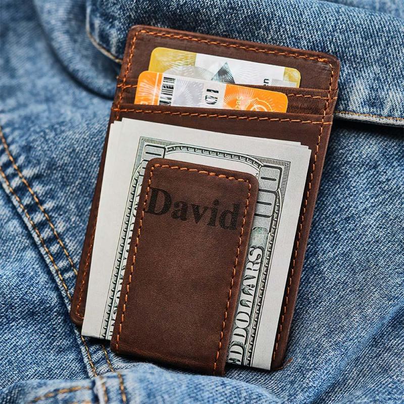 Personalised Name Leather Wallet Magnetic Money Clip for Him
