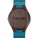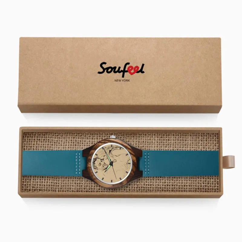 Women's Engraved Wooden Photo Watch Blue Leather Strap - Sandalwood